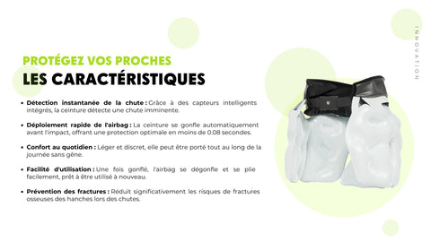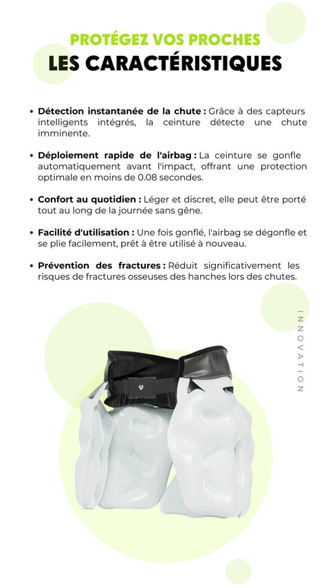 La ceinture airbag de protection protège les parties essentielles du corps en cas de chute, incluant les hanches et le bassin, prévenant ainsi les traumatismes graves. Parfaitement adaptée aux personnes à risque de chute, elle réduit les conséquences physiques et psychologiques des chutes.